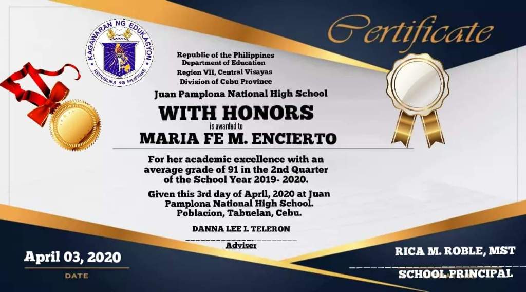 My Certificate Posted bymariafeenciertoDecember 11, 2019Posted inUncategorized Share this: Click to share on X (Opens in new window) X Click to share on Facebook (Opens in new window) Facebook Like Loading... Related Published by mariafeencierto A simple girl who is determined to success. View more posts